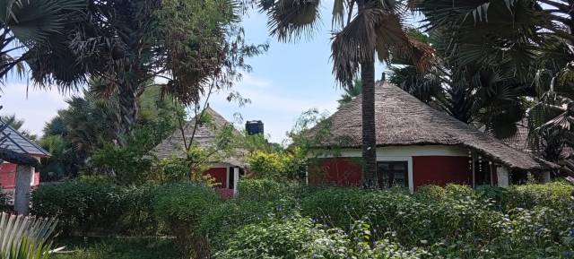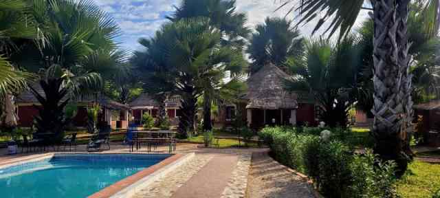 16 dieser 75qm Rundhütten stehen auf dem riesigen tropischen Gartengelände, die letzten werden nun verkauft. Es besteht in Gambia die rechtlich abgesicherte Möglichkeit, günstiges Wohneigentum zu kaufen. In unserem Beispiel handelt es sich un das Afropolis, einer Art “Gated Community”. Eine der hier gezeigten Rundhütten kann für unter 40.000 € erworben werden. Der tropische Garten, der Pool und ähnliches mehr sind Gemeinschaftseigentum.